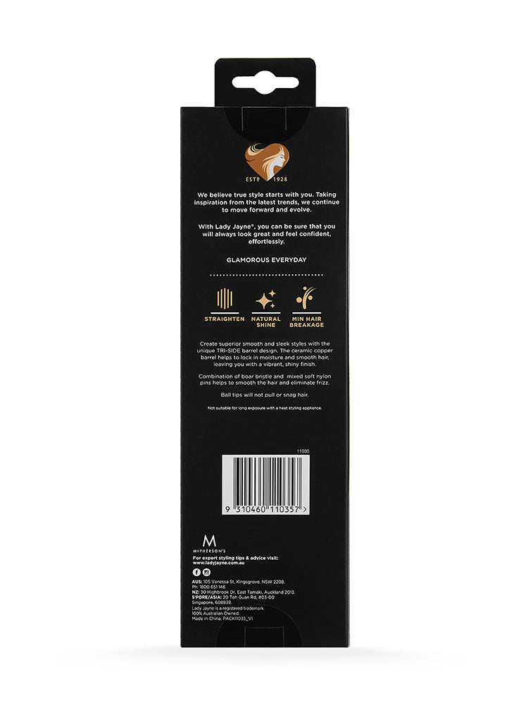 Engineered to maneuver as close to the roots creating straight locks while also creating lift & volume. The combined ceramic copper barrel assists in temperature control for rapid even-heat distribution locking in moisture leaving hair vibrant with a shiny finish while the mixed boar bristles and soft nylon pins help eliminate frizz for smooth soft hair.