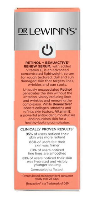 RETINOL + BEAUACTIVE® RENEW SERUM, with added Vitamin E, is an advanced concentrated lightweight serum for rough textured, dull and sun-damaged skin that targets lines, wrinkles and age spots.