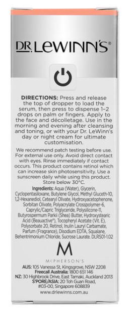 Press and release the top of the dropper to load the serum, then press to dispense 1-2 drops on palm or fingers. Apply to the face and decolletage. Use in the morning and evening after cleansing and toning, or with your Dr. LeWinn's day or night cream for the ultimate customisation.