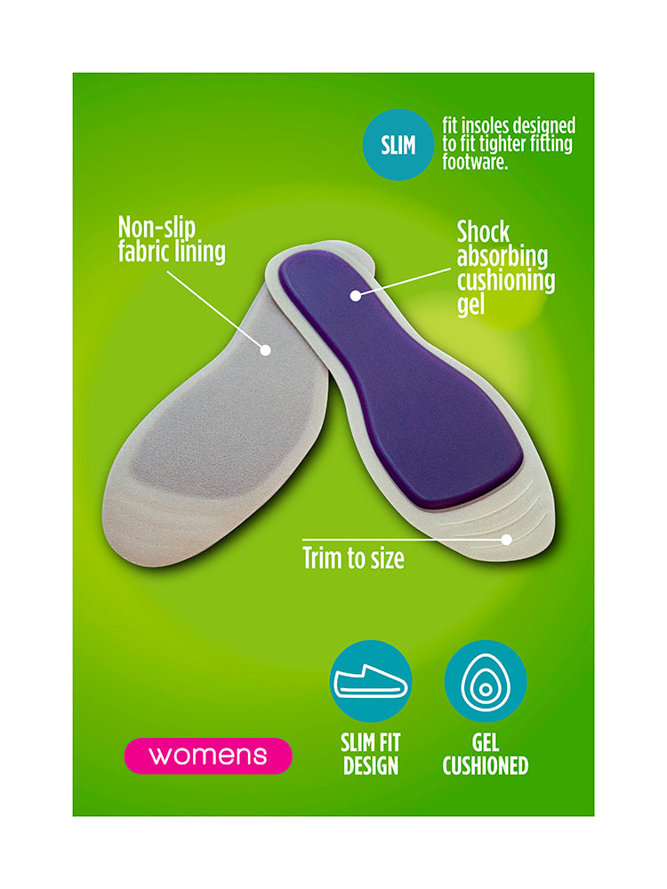 Shock absorbing gel cushioned insoles with non-slip fabric lining for all day comfort.